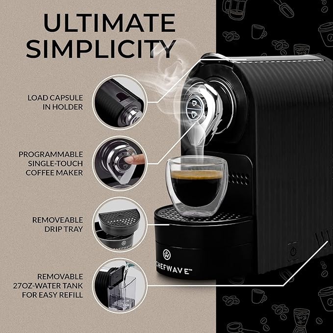 ChefWave Espresso Machine and Coffee Maker (Black) - Compatible with Nespresso Capsules, Programmable, One-Touch, Italian 20 Bar High-Pressure Pump Bundle with Pod Holder and Glasses