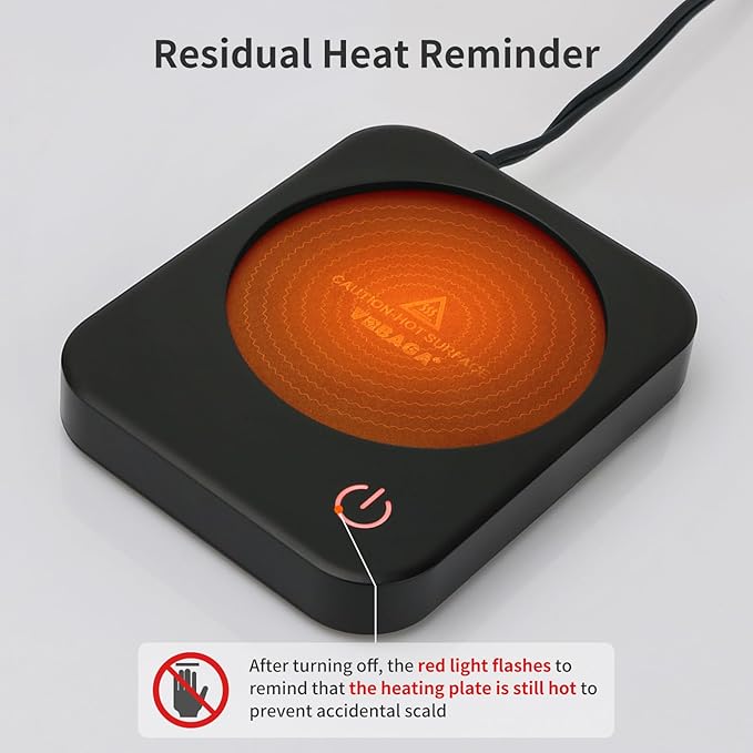 - ☕Automatic Shut Off and Residual Temperature Reminder: This beverage warmer with an auto shut off function after working 4 hours(Note: you also can touch the “Power" button to turn it off). After turning off the coffee warmer, the red light flashes for a while to remind that the heating plate is still hot and It will stop until the temperature donw to 97℉ (36℃).