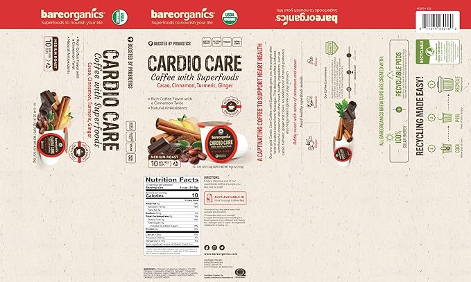 - Cardio Care Coffee: BareOrganics Cardio Care coffee contains a blend of fair trade Guatemalan coffee ground from Arabica beans for superior quality and taste, along with natural, organic ingredients to support overall cardiovascular health