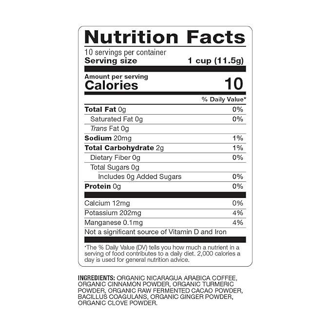 - Organic Coffee: Each individual cup of this organic coffee is infused with heart-friendly cacao, cinnamon, turmeric and ginger. Probiotics in this turmeric coffee boost the impact of these ingredients by supporting digestive health with every sip