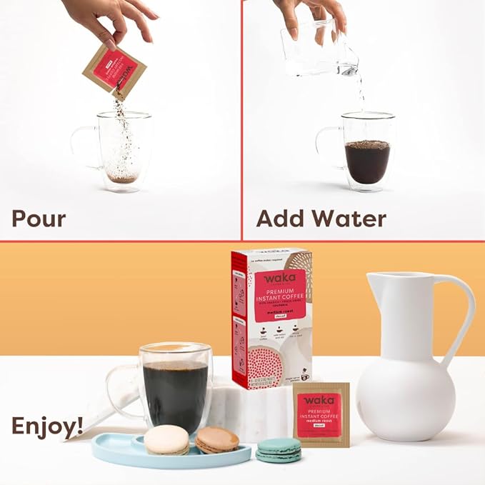 Waka Premium Decaf Instant Coffee Sachets — 100% Arabica Freeze Dried Beans — For Hot or Iced Coffee (8 Count, Decaf Medium Roast)