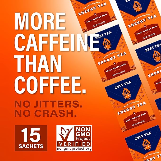 Zest Tea Premium Energy Hot Tea, High Caffeine Blend Natural & Healthy Black Coffee Substitute, Perfect for Keto, 135 mg Caffeine per Serving, Spicy Masala Chai Black Tea, Box of 15 Sachet Bags