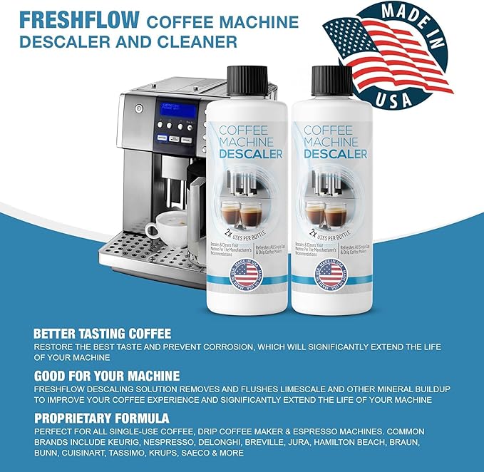 - GOOD FOR YOUR MACHINE: No matter the purity of your water source, all water eventually leads to a buildup of limescale and corrosion over time. This causes your machine to run slowly, produce less coffee per brew cycle, and it impacts taste. FreshFlow descaling solution removes and flushes limescale and other mineral buildup to improve your coffee experience
