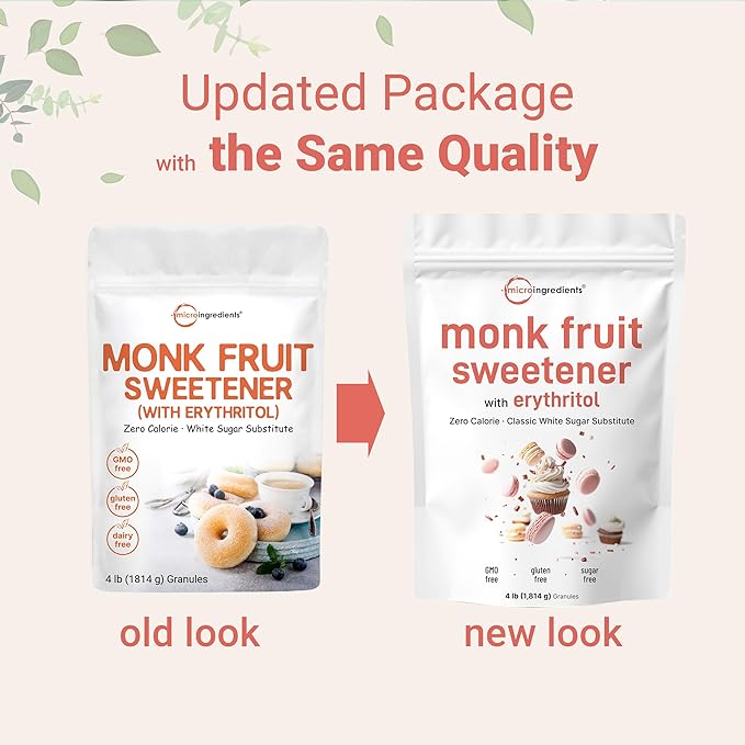 - Monk Fruit Granular with Erythritol Sweetener, 1:1 Sugar Substitute, 4 Pound (64 Ounce), Premium Monk Fruit Erythritol and Monk Fruit Sugar Substitute, Keto Diet Friendly, No After Taste.
