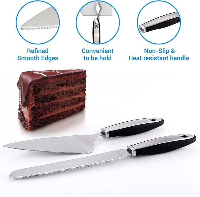 - [ PREMIUM QUALITY ] - This cake knife and server set is made of safe, non-toxic, food-grade high-quality stainless-steel material. The ultra-sharp serrated blade offers precision and cutting flexibility with easy cleaning