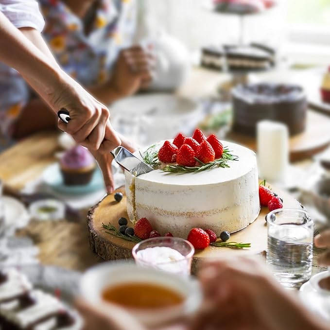 - [ GOOD PRACTICALITY ] - Cake cutter and spatula are designed with a comfortable grip with safe handling. The widened spatula panel has enough space to prevent pieces from falling off while moving and for ultimate control when slicing