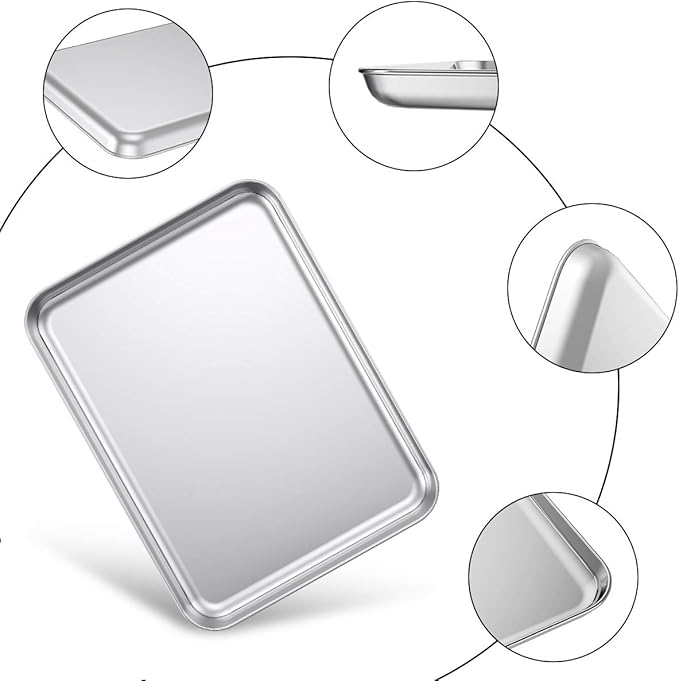 - PREMIUM MATERIAL: No more aluminum into your food, great replacement to aluminum pan. The baking sheets are made of 18/0 stainless steel without chemical coating or any other materials. Rust resistant and durable for many years