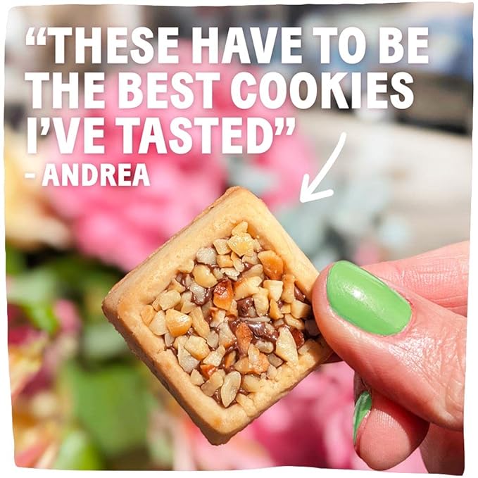 - GOURMET SHORTBREAD COOKIES: 3 bags of 15 individually wrapped butter cookies filled with soft hazelnut-chocolate ganache and sprinkled with real bits of toasted hazelnut.
