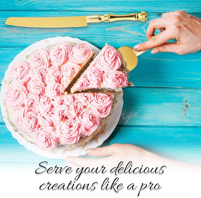 - 🍴 EXQUISITE CRAFTSMANSHIP: Our Gold Cake Knife and Server Set are expertly crafted from premium stainless steel, meticulously polished to a mirror-like finish. Each pack comes with an elegantly crafted stainless steel cake knife and cake server that are designed to add a memorable and sophisticated touch to the look of any cake cutting-ceremony.