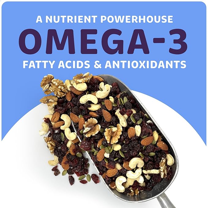 - HEART-HEALTHY GOODNESS - Opt for a smarter snacking choice with our trail mix nut blend of cashews, almonds, walnuts, pepitas, dried cranberries, and raisins. It's a great alternative to sugary snacks, offering a touch of sweetness with nutrients and antioxidants for your heart.