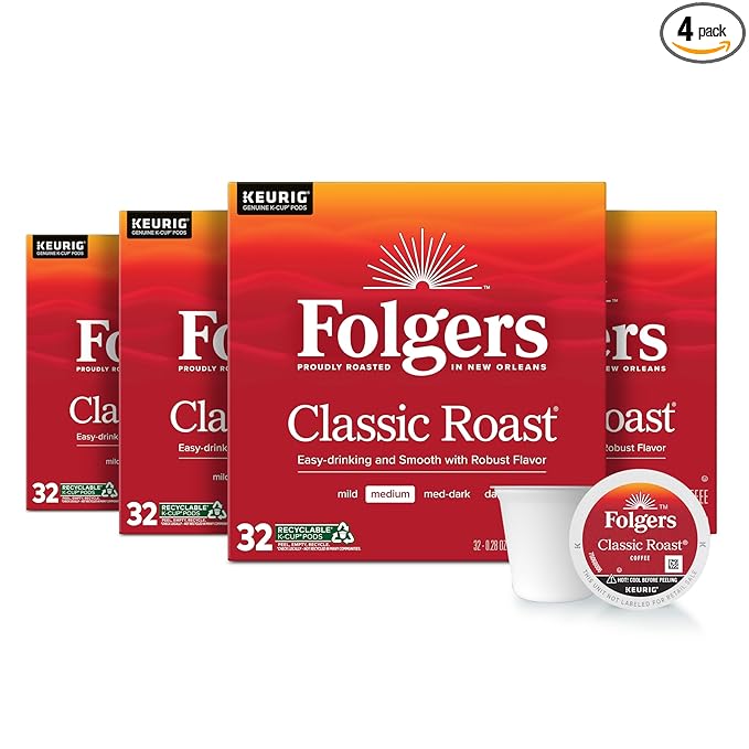 - Contains four (4) thirty-two (32) count packages of Folgers Classic Roast K-Cup pods