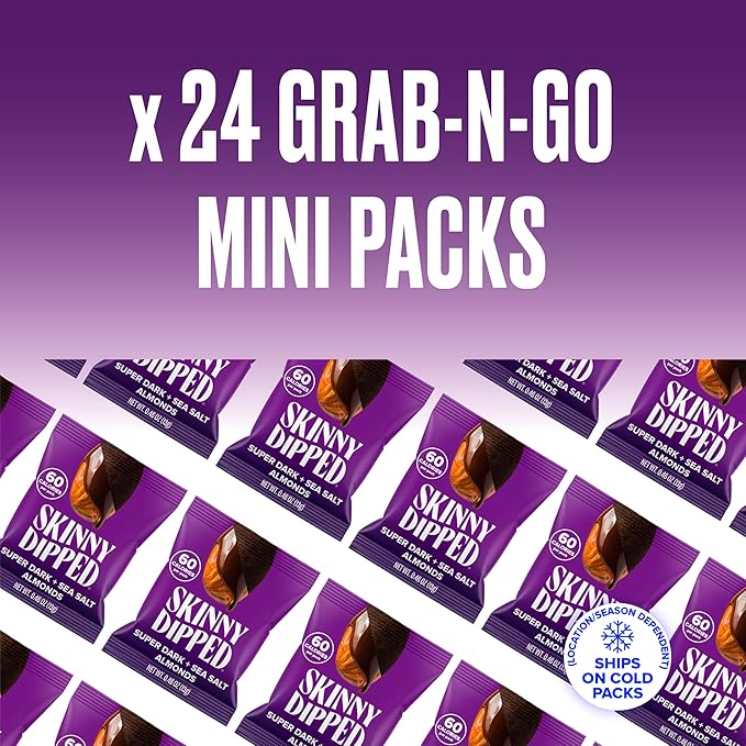 - PERFECT PORTIONS: Each mini bag is 60 calories and is sized to be the ideal on-the-go snack. This pack includes (24) 0.46 oz bags of SkinnyDipped Super Dark + Sea Salt Almonds.