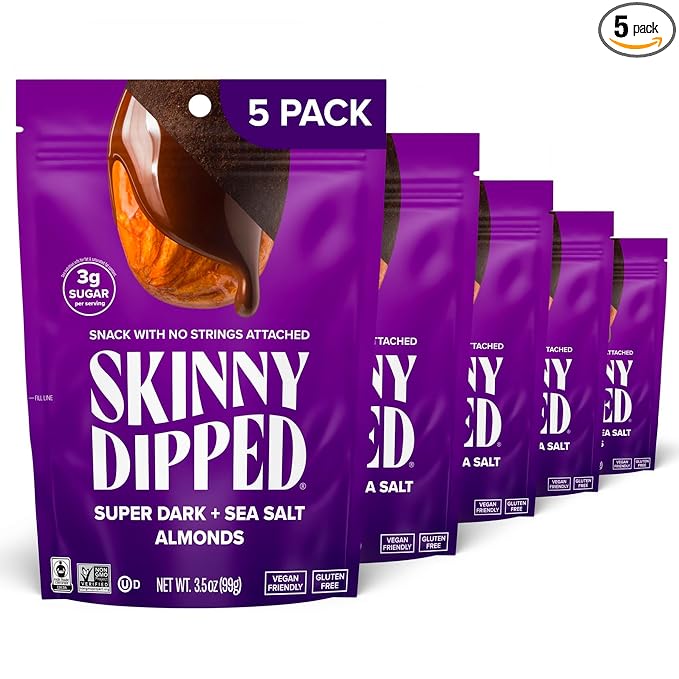 - RESEALABLE BAGS: This pack includes (5) resealable 3.5 oz Bags of SkinnyDipped Super Dark + Sea Salt Almonds.