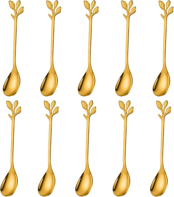 AnSaw Elegant Gold Leaf Coffee Spoons - 10-Piece, 4.7" Mini Stainless Steel Espresso & Dessert Tea Spoons, Perfect for Demitasse & Small Servings