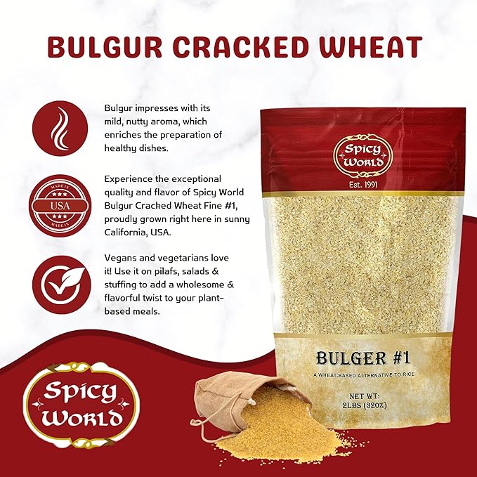 Bulgur Cracked Wheat Fine #1, 2 LB Bag (32oz) | USA Grown Bulgar Wheat for Tabouleh | 100% Natural & Pure | Great for Vegan Recipes by Spicy World