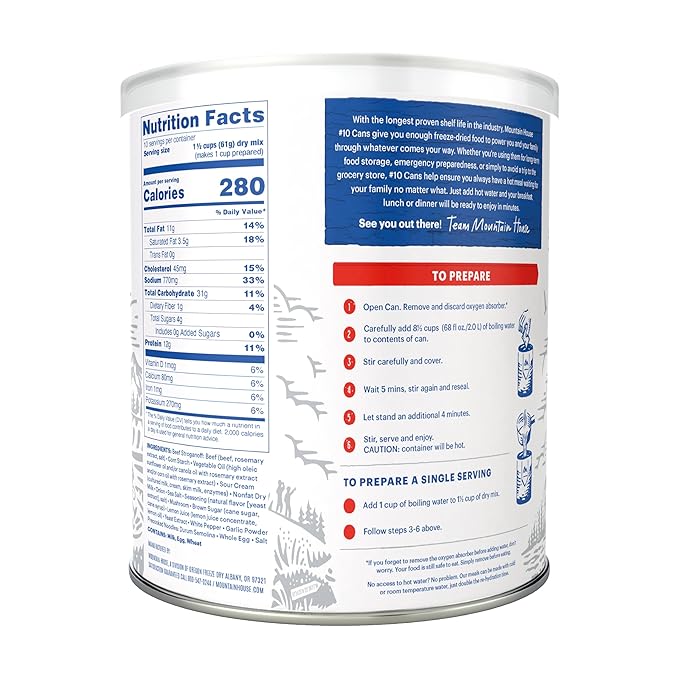 - BEST-TASTING COMFORT FOOD - Freeze-dried to lock in nutrients and freshness, enjoy tender beef, egg noodles, savory mushrooms and onions in a creamy sauce. Mountain House #10 Cans are perfect for group camping trips, hunting expeditions, and more.
