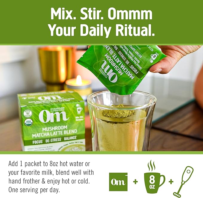 OM MUSHROOM SUPERFOOD Matcha Latte Blend Mushroom Powder, Single Serve, 10 Count, Green Tea, Lion's Mane, Reishi, Chaga, Turkey Tail, Focus & Stress Support Supplement