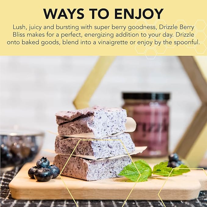 Drizzle Berry Bliss Raw Honey - All Natural Pure Raw Honey with Organic Blueberry, Unfiltered & Unheated, Use in Tea & Coffee, Sugar Substitute, Certified Kosher - 13.2 oz Jar (375 g)