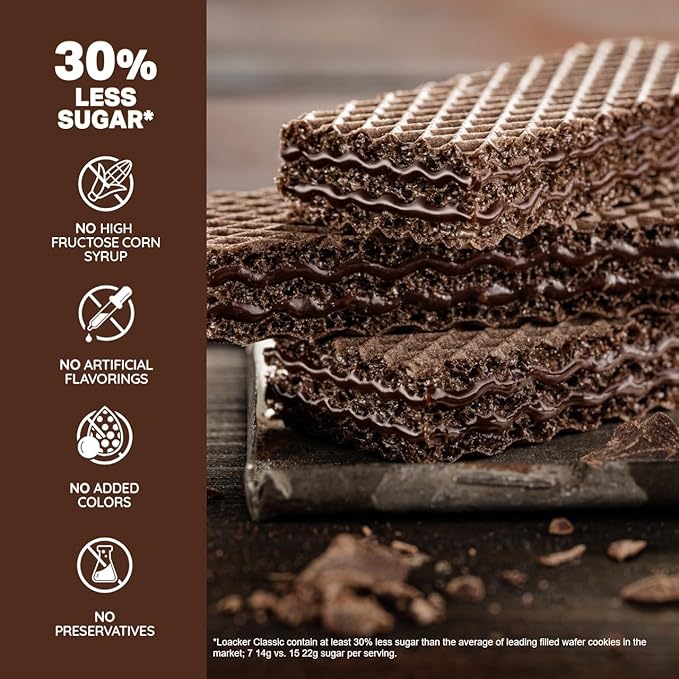 - Premium cream-filled wafer cookie - Three fragrant cocoa wafers and two rich layers of chocolate cream filling melt in your mouth. Loacker Classic Double Choc wafer cookie comes in a box of 12 sweet snack packs, making this classic flagship European dessert perfect for stocking up on your favorite snack.