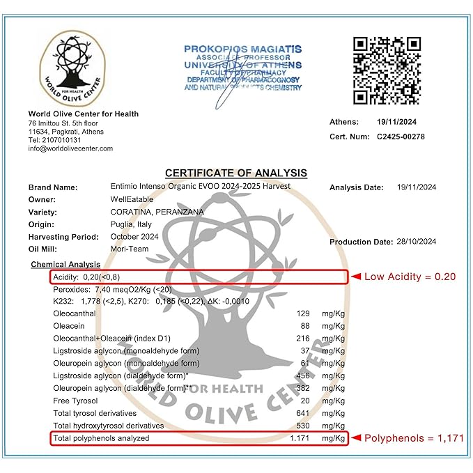 - Superfood - Extra virgin olive oil rich in polyphenols (> 900 mg/kg) such as oleocanthal and oleuropein; Low acidity, less than 0.25%; High monounsaturated fats (> 70%) such as oleic acid; High smoke point (> 470F)