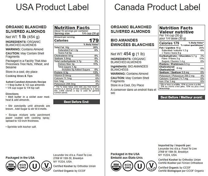 Food to Live Organic Blanched Slivered Almonds, 1 Pound – Non-GMO, Raw, Unpasteurized, Unsalted, Vegan, Keto, Paleo, Kosher, High in Protein, Dietary Fiber. for Cooking, Baking, Salads and Cereals