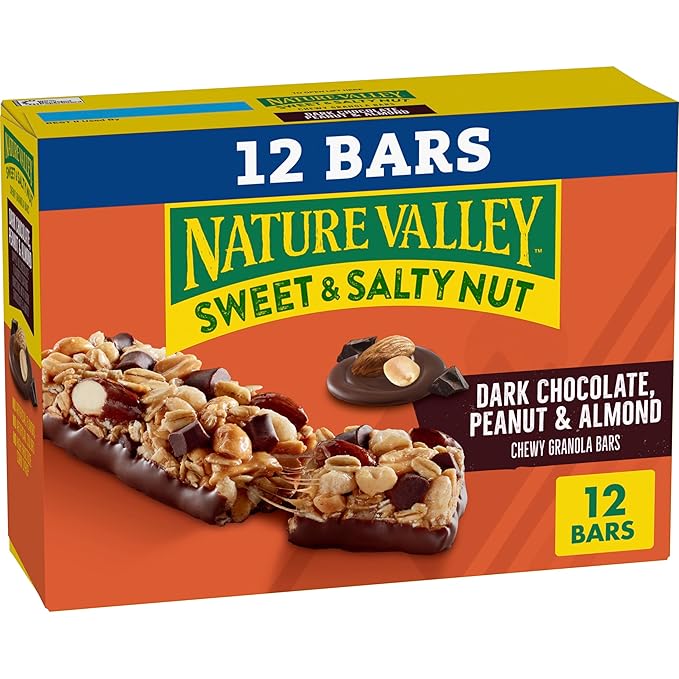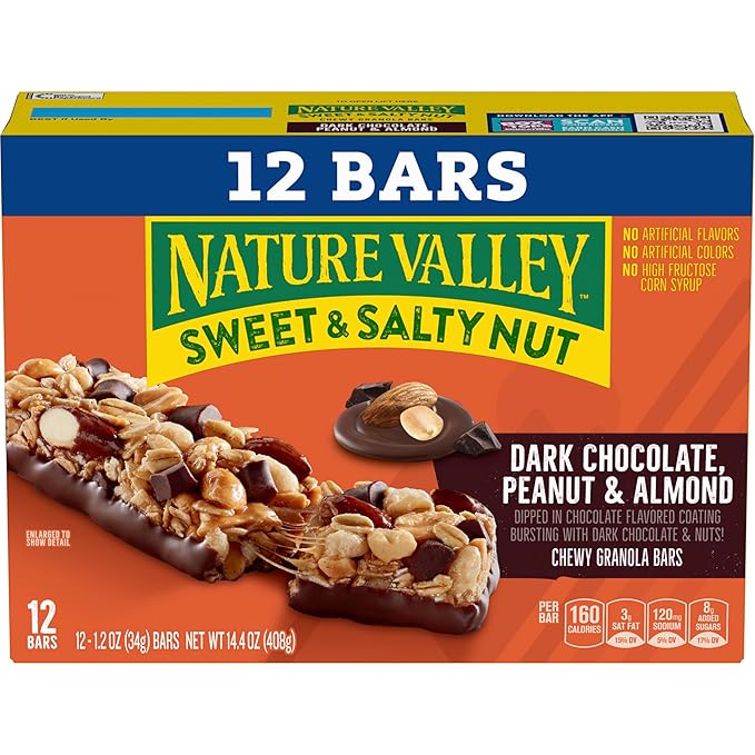 - CONTAINS: One 14.4 oz box of Nature Valley Whole Grain Dark Chocolate Peanut Almond Sweet and Salty Nut Granola Bars; 12 bars