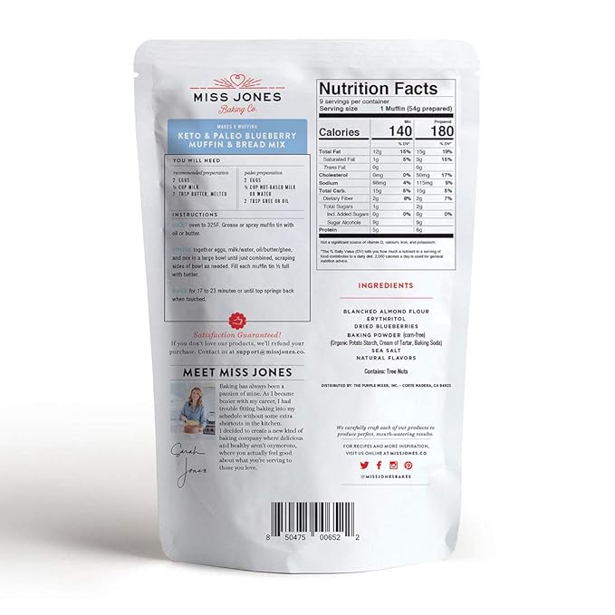 - LOW CARB AND NO ADDED SUGAR: Miss Jones Baking Co.'s Blueberry Muffin Mix contains 0g added sugar and only 4g net carbs