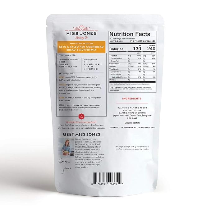 - LOW CARB AND NO ADDED SUGAR: Miss Jones Baking Co.'s Not Cornbread Mix contains 0g added sugar and only 3g net carbs