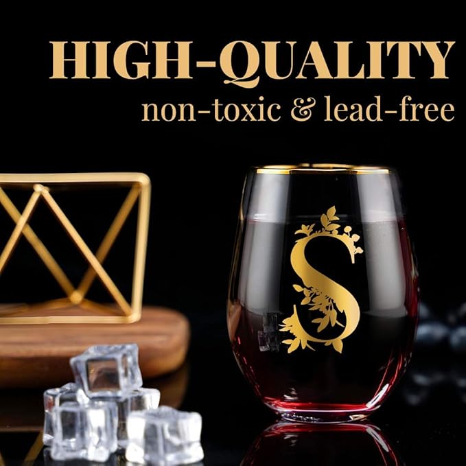 Onebttl Unique Stemless Wine Glasses, Initial Wine Cup for Red or White Wine - 18oz, Monogrammed, Gold - for Women, Girls, Female, Her, Friends, Coworkers, Clients - for Birthday, Christmas