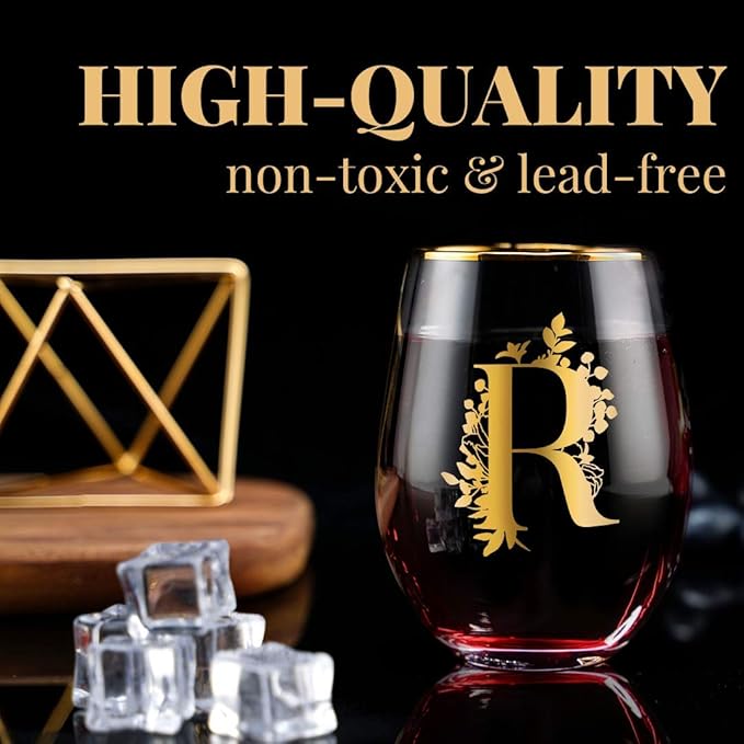 Onebttl Unique Stemless Wine Glasses, Initial Wine Cup for Red or White Wine - 18oz, Monogrammed, Gold - for Women, Girls, Female, Her, Friends, Coworkers, Clients - for Birthday, Christmas