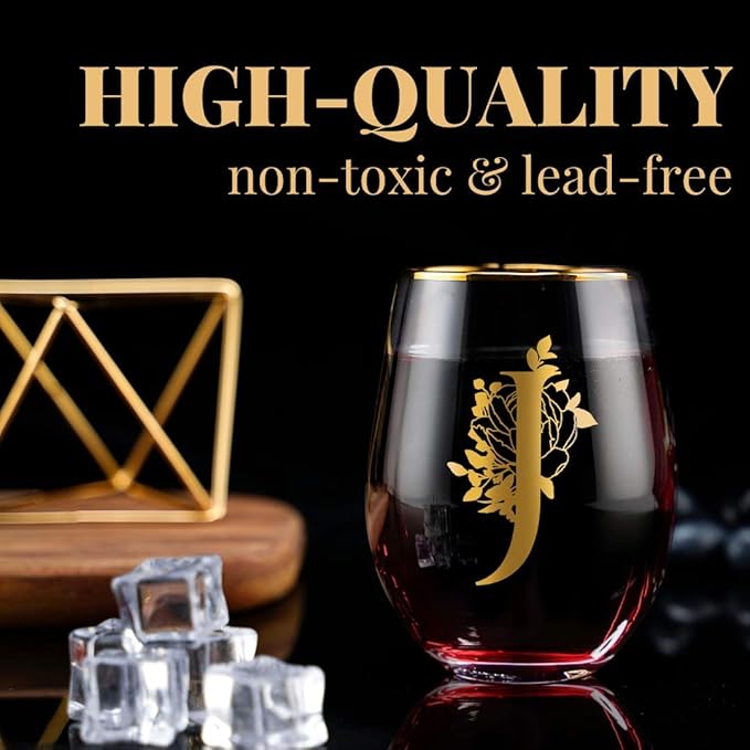Onebttl Unique Stemless Wine Glasses, Initial Wine Cup for Red or White Wine - 18oz, Monogrammed, Gold - for Women, Girls, Female, Her, Friends, Coworkers, Clients - for Birthday, Christmas