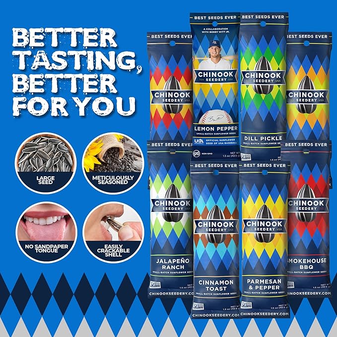 - LOW SALT SUNFLOWER SEEDS VARIETY PACK - NOW WITH 8 FLAVORS: Whether it's fueling the entire ball club or embarking on a road trip adventure, our single-serve cases have you covered, now with even more to share! Enjoy an expanded selection of 8 delectable flavors: Original, Parmesan & Pepper, Jalapeno Ranch, Lemon Pepper, Smokehouse BBQ, Hatch Chile, Dill Pickle, and Cinnamon Toast. Dive into a flavor-packed adventure with Chinook Seedery Sampler Pack!