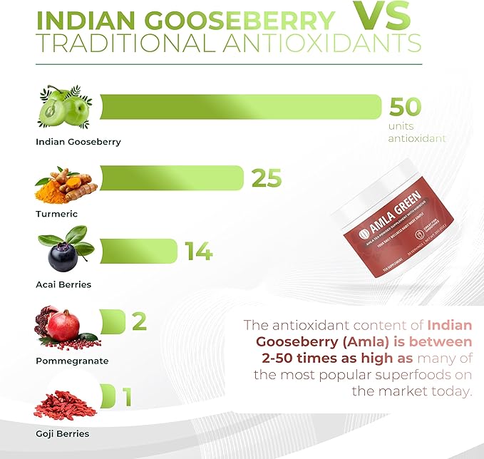 - THE ORIGINAL 20X CONCENTRATED AMLA SUPPLEMENT: Amla Green is your daily superfood powder supplement delivering unmatched antioxidative support through 20x concentrated amla with an ORAC Value of 261,500, which is 75 times higher than goji berries. Supported by published research, including clinical trials, amla has shown positive results for youthful benefits and critical areas of vitality and health.