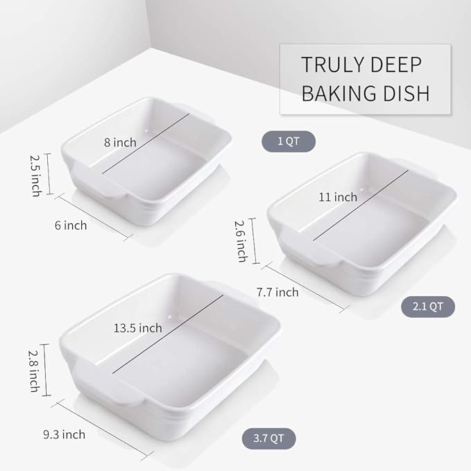 - 【GOOD SIZE FOR DAILY USE】: The KOOV baking dish set includes 3 pieces bakewares of difference dimensions ( excludes the ears' size): 13.5"L x 9.3"W x 2.8"H and 11"L x 7.7"W x 2.6"H and 8"L x 6"W x 2.5"H, suitable for lasagna, spaghetti, chicken, meat, beef, roasting, vegetables, storing and reheating leftovers and etc.
