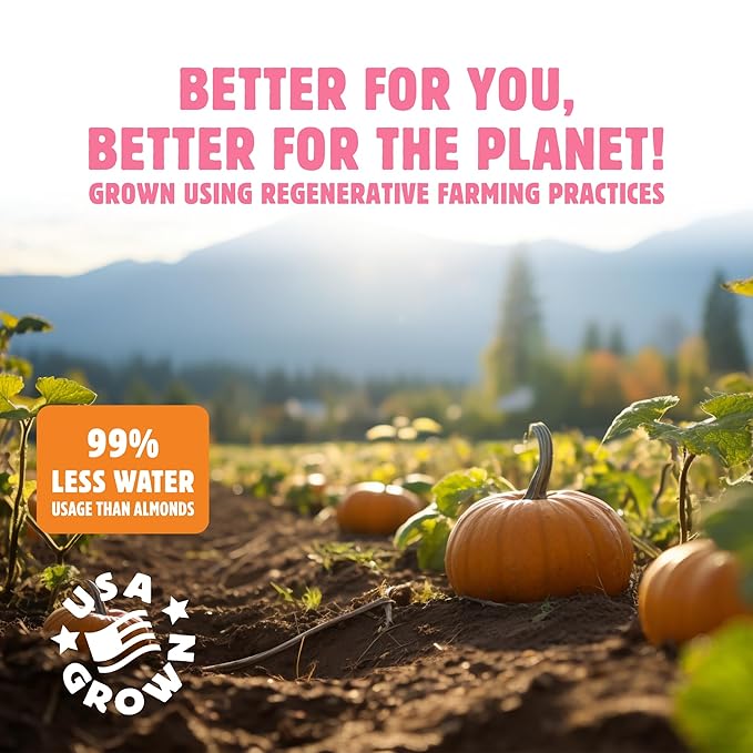 - USDA ORGANIC, SUSTAINABLY FARMED, AND AMERICAN GROWN - Most salted pumpkin seeds and sold today are imported—ours are American made, grown on U.S. farms using regenerative, organic methods that reduce water use, preserve soil health, and support biodiversity. We use 99% less water than almonds, rely on 100% organic inputs, rotate crops, avoid chemicals, and protect native pollinators. Nothing is wasted, and everything is done with care—from seed to soil to snack. You can taste the difference.