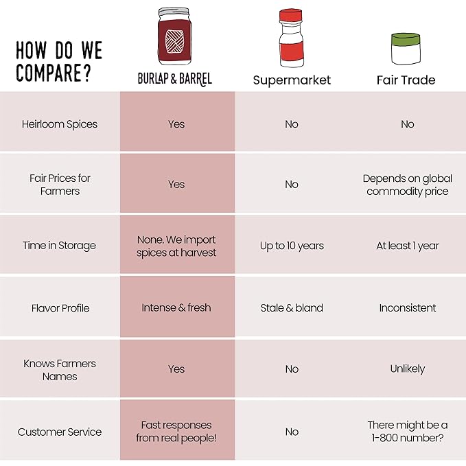 - Single Origin - Burlap & Barrel partners directly with small farms to source incredibly flavorful single-origin spices. Our spices are sourced directly from small farms around the world. They are harvested by hand, dried naturally, grown sustainably whenever possible, and transported directly to preserve freshness.