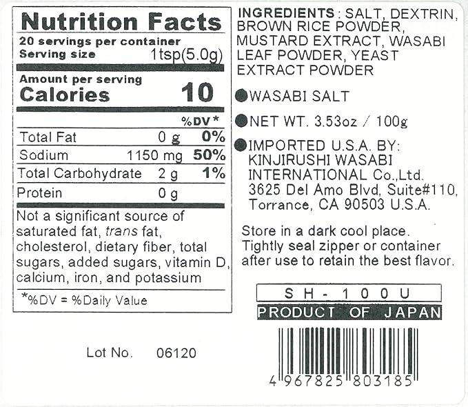 Kinijrushi Japanese Genuine WASABI SALT (3.5oz) - Gluten Free, Vegan, Wasabia Japonica, Genuine Wasabi, Wasabi Powder, Japanse Salt, Real Wasabi, Popcorn Seasoning, Margarita Salt, Umami Seasoning, Seasoned Salt, Wasabi Snacks, Tempura Salt, Gourmet Salt