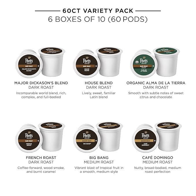 - Contains six (6) Boxes of 10 Peet's Single Serve Coffee Pods, One Box Each of Major Dickason's Blend, Big Bang, French Roast, Café Domingo, Organic Alma De La Tierra, and House Blend (60 Pods Total) - 100% Arabica Coffee.