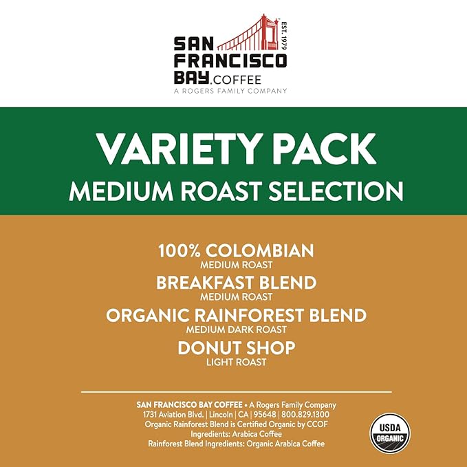 San Francisco Bay Compostable Coffee Pods - Variety Pack Medium Roast (40 Ct) K Cup Compatible including Keurig 2.0, Colombian, Breakfast, Organic Rainforest, Donut Shop