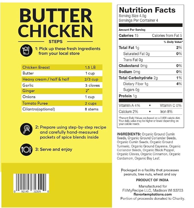 - QUALITY INGREDIENTS - Flavor Temptations uses organic spices from Indian farms. 100% Natural, Gluten Free, Salt Free, Sugar Free, and no artificial colorings or flavors. Spices pre-measured and packed in individual stay-fresh bags for a joyful cooking experience.