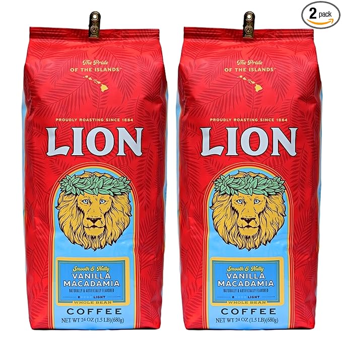 Lion Coffee, Arabica Coffee Beans, Light Roast Whole Bean Coffee, Vanilla Macadamia Flavor, A Taste of Aloha, 24 Ounce Bag (Pack of 2)