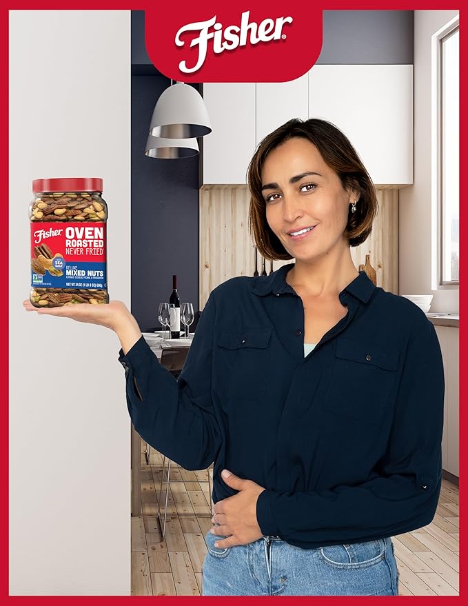 - Convenient Snacking ─ Contains 1, 24-ounce reusable canister of Fisher Oven Roasted Never Fried Deluxe Mixed Nuts, an ideal snack to keep on hand for busy days on-the-go, at work, at home, or in between meals