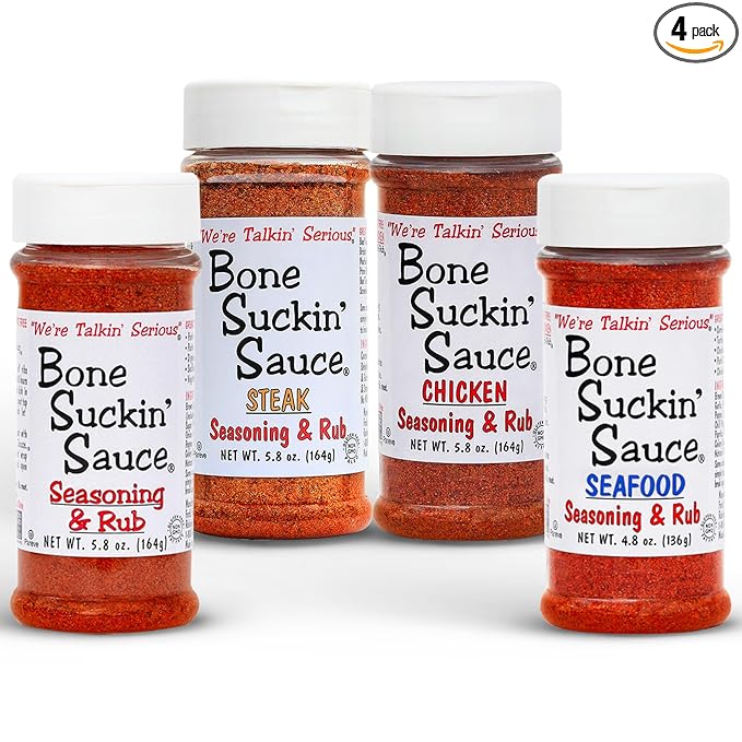 - Bone Suckin’ Seasoning & Rub, 5.8 oz. You will wonder how you ever lived without it! Our Original Seasoning & Rub is a proprietary blend of brown sugar, paprika, garlic and spices that is perfect for marinating and BBQ – even popcorn and salads. Great on Ribs, Pork, Beef, Chicken, Seafood, Venison, Beans, Pasta, Vegetables, Steaks… just about anything.