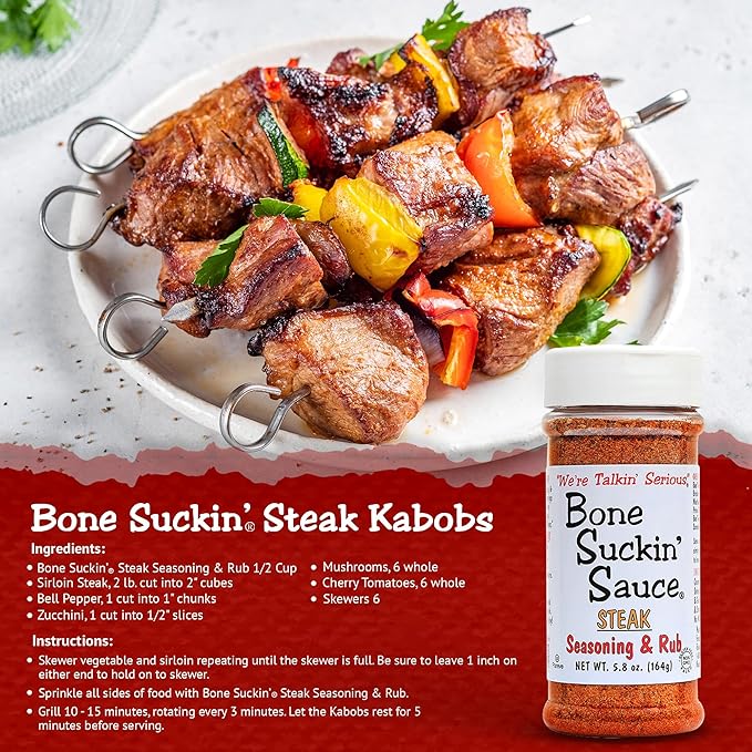 - Bone Suckin’ Steak Seasoning & Rub, 5.8 oz "Good Grilling recipes come from backyard cookouts with good friends.” This was the inspiration for our new Bone Suckin’ Steak Seasoning & Rub. Our unique blend of spices and herbs will make the most savory steaks you've ever had! Turn your Home into a Steak House! Super Easy – Rub seasoning on Steaks, place steaks on grill and enjoy the compliments. Versatile enough to be used on just about anything – Try it on Potatoes!