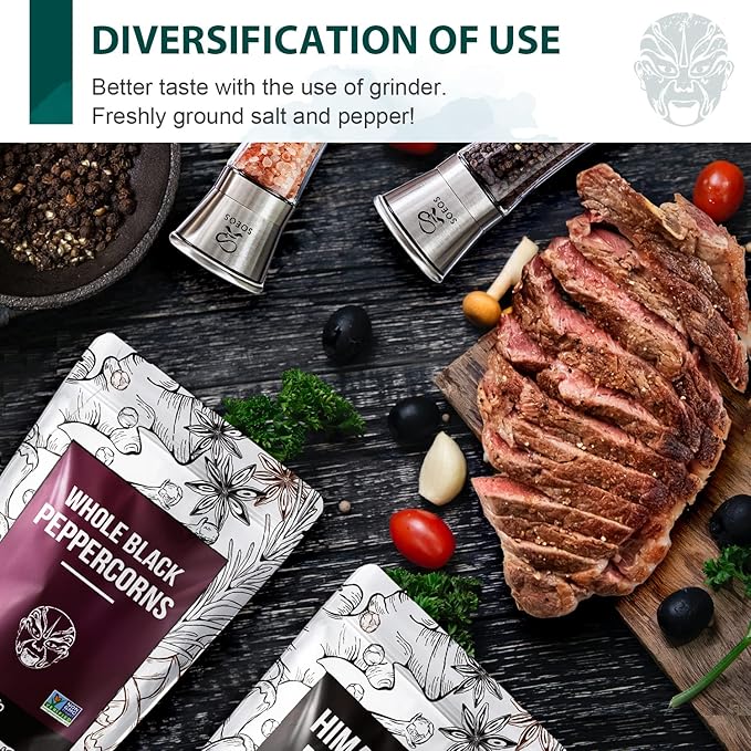 Soeos Whole Black Peppercorns 12oz + Himalayan Pink Salt 2lb, Salt and Pepper for Grinders, Black Peppercorn Refil, Pink Himalayan Sea Salt, 2 Piece Set