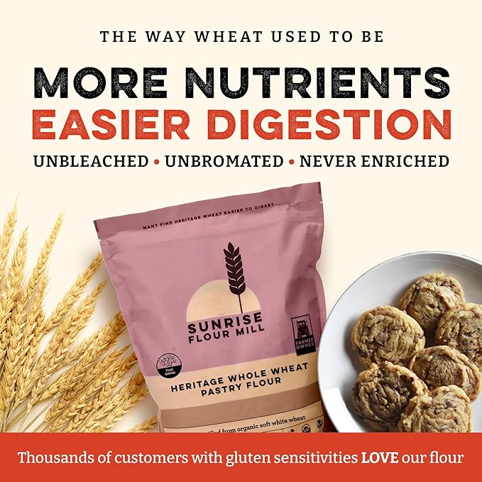 Sunrise Flour Mill USDA Organic Heritage Whole Wheat Pastry Flour - 2 lbs | Great for Gluten Sensitive People | Easier to Digest with Less Bloating | No Bleaching or Bromating | Zero Additives