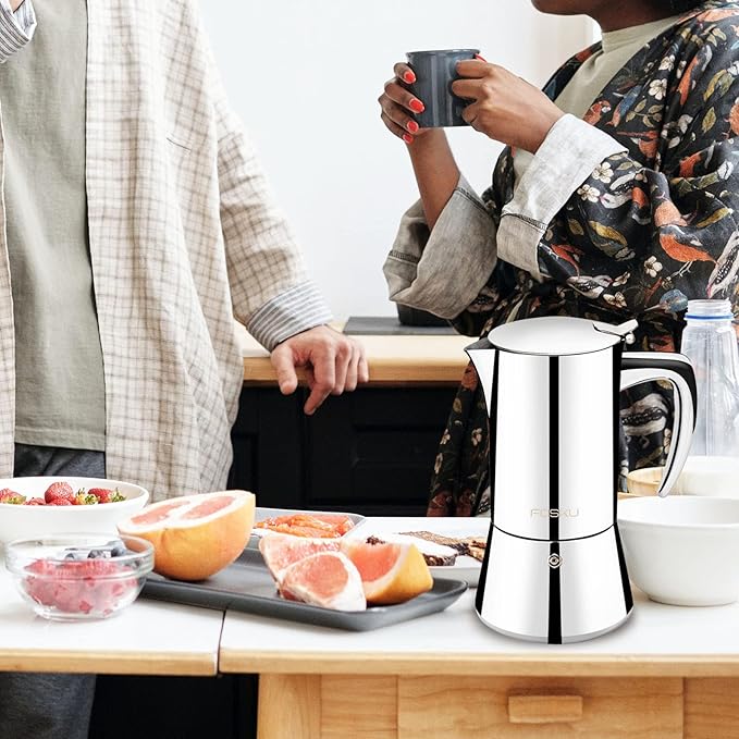 - ELEGANT DESIGN & STRUCTURE DETAILS -- With sleek and beautiful appearance, the espresso pot must be a modern and elegant addition to kitchen. Mirror polished. U style spout easy pour. Heat resistant handle. The lid on the top can be left open.