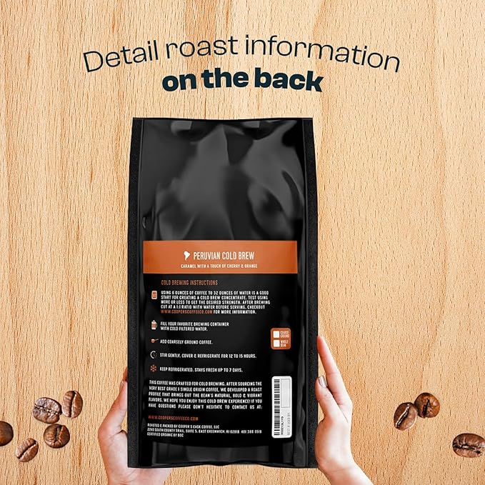 - Smooth Flavors: Savor the Cooper's Cask Coffee Peruvian beans—a medium roast with a robust and complex taste profile; From the smooth caramel undertones to the hints of cherry and citrus, each sip encapsulates the essence of Peru, leaving a lasting impression