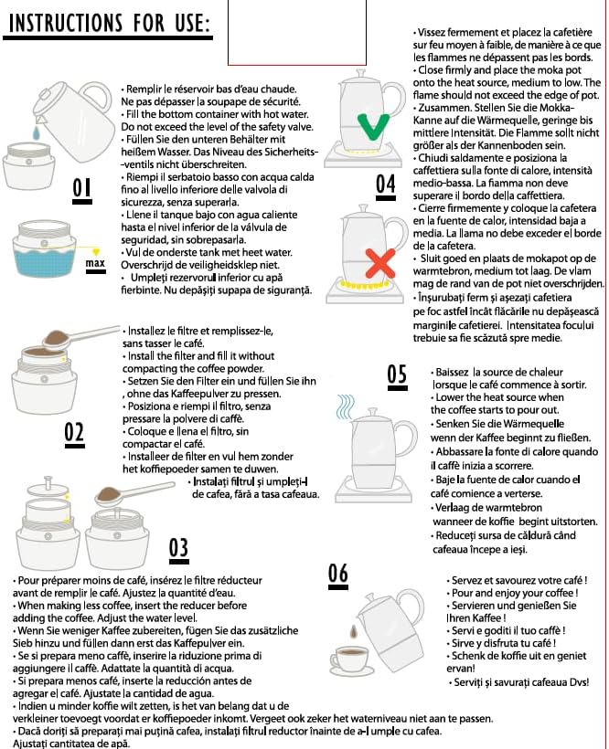 - High-end Moka Pot - Geared with the Finest Accessories: While most regular glass or aluminum Moka pots are easy to break or rust over time, our premium stovetop espresso coffee maker was engineered from the most durable quality stainless steel, making it the greatest present to pass down for a lifetime. Double-filter technology and a safety release valve control water pressure for that delicious espresso. Always start your morning with freshly brewed and warm aromatic coffee!