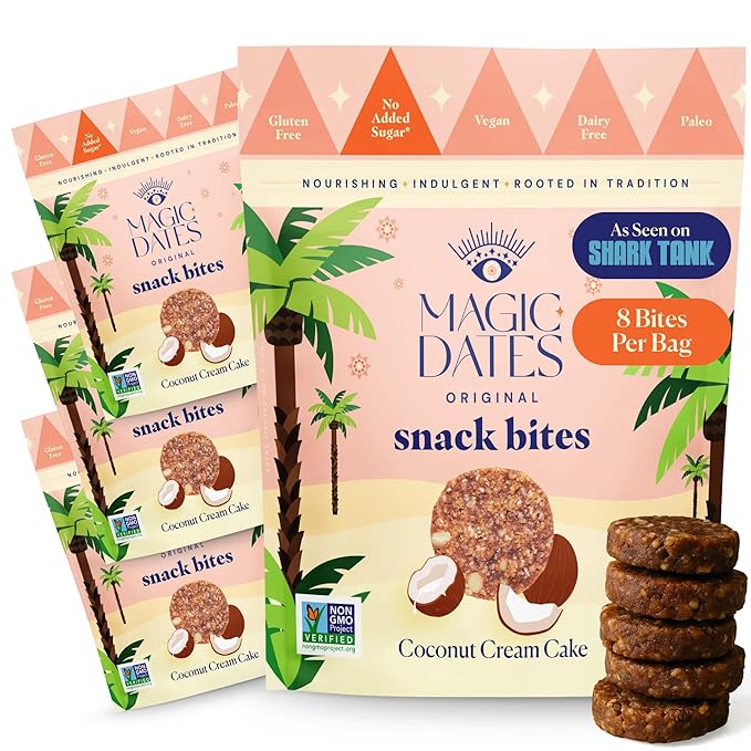 MAGICDATES Date Snack Bites | Coconut Cream Cake – 4 Bags (16 Servings) | Medjool Dates | No Added Sugar | Gluten-Free | Vegan | Paleo | Plant-Based | Healthy Coconut Snack | Clean Ingredients